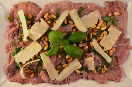 Oxfilé carpaccio, hyvlad parmesan, parmesanost, pinjenötter, olivolja, ruccola och tryffelmajo 139 kr