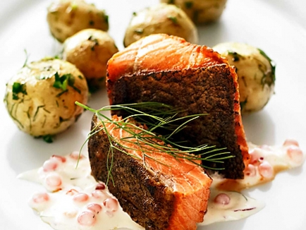 - Grillad laxfilé serveras med skagenröra, sparris, citron, dill, potatismos och grillad tomat.